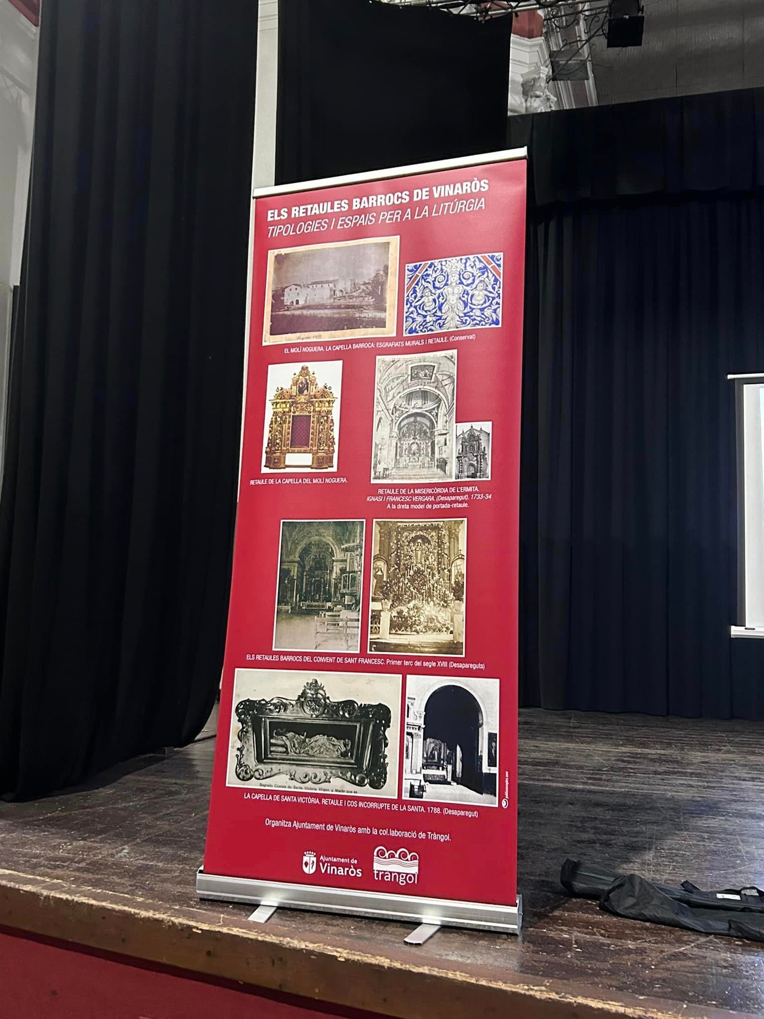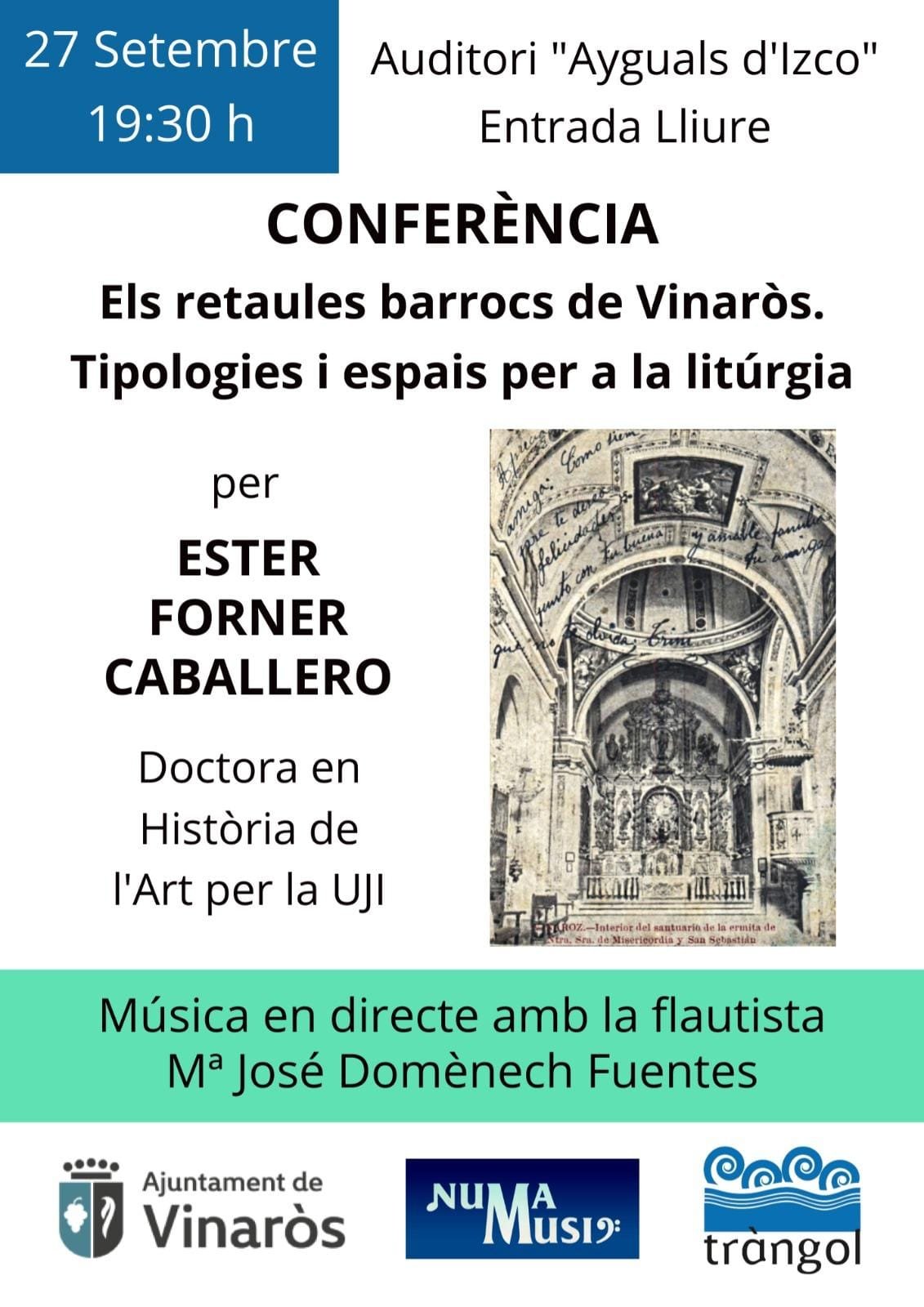 El passat divendres 27 es va dur a terme una conferencia a càrrec d’ Ester Forner, amb música en directe de Maria José Domenech NUMA MUSIC. L’acte va estar organitzat per l’Ajuntament de Vinaròs i Tràngol, Grup de Debat i Recerca. Forner va explicar l’espiritualitat barroca del poble i un creixement demogràfic que es va traduïr amb la gran producció de peces d’art. Es van tractar els retaules de L’ermita, en concret el del altar major de Francesc i Ignasi Vergara i els retaules que van existir al convent de Sant Francesc i a la capella de Santa Victoria. Gràcies a l’Ajuntament per esta oportunitat i als que van assistir al acte.